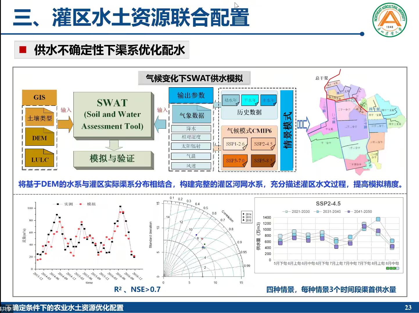 报告会上,李茉教授以全球水土资源短缺、碳中和、气候变化为背景,深入研究包含多尺度、多过程、多阶段、多目标、多要素等特点的复杂大系统问题。并从“农田灌溉水高效配置”、“灌区水土资源联合配置”、“区域水-能源-粮食协同调控”三个不同维度的农业水土资源优化配置进行了详细讲述,并分别对三个维度所建立的模型在黑龙江省应用模拟的结果进行展示与讲解。最后,李茉教授对“不确定条件下农业水资源可持续调控体系”的结构和组成进行总结,并对农业水土资源优化配置理论探索及应用、智慧灌区建设应用等研究提出思考与展望。