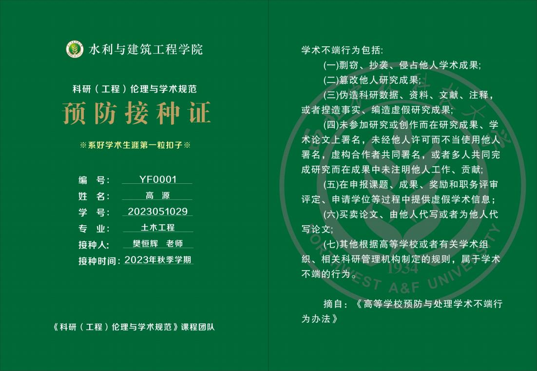 近日,任我院《科研伦理与学术规范》授课的张富仓教授、樊恒辉研究员分别为学博、学硕研究生颁发了学术预防接种证。《科研伦理与学术规范》是2023版研究生培养方案中新增的一门课程,其目的是让刚刚步入学术生涯的博硕士研究生学会识别科研不端行为,树立诚信意识,端正学术态度,弘扬科学精神,做负责任的研究生,在以后的科研活动中能够做到遵循科研伦理与学术规范,共同营造风清气正的科研道德环境。本门课程在授课中,结合我校涉水工科学科的实际情况,分析研究科研伦理及其规范,梳理违反学术伦理和规范的典型案例,在课程授课中渗透思政元素、贯穿历史哲学文化,注重理论性与实践性相统一,系统介绍科研过程中可能遭遇的学术风险雷区、处理流程及应对策略,为未来研究生从事科研工作打好良好的基础,并为他们系好学术生涯第一粒扣子。