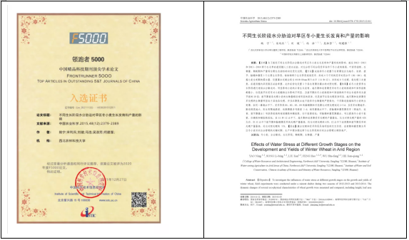 近日,我院农业水土工程学科团队发表在《中国农业科学》2015年第48卷12期上的论文《不同生长阶段水分胁迫对旱区冬小麦生长发育和产量的影响》被中国科学技术信息研究所评为2020年度“领跑者5000—中国精品科技期刊顶尖学术论文(F5000)”。该论文第一作者为姚宁副教授,通讯作者为何建强教授。该文通过2012—2013和2013—2014两个生长季在遮雨棚下进行的人工控水试验,对比分析了不同分段受旱条件下冬小麦的株高、叶面积指数、生物量、物候期和产量等生理生态指标的动态变化过程。